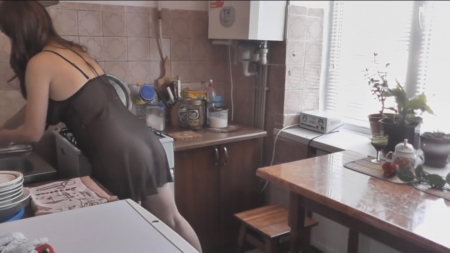 Ну что, доброе утро, страна! Сейчас Высоцкий будет петь про "Руки шире, выполняйте правильно движе-ни-я!", а брюнетка будет заваривать себе крепкий кофе, чтобы не помереть на работе в душном офисе, провалившись в летаргический сон. Турка закипела, и божественный напиток уже налит в кружку, пьяня своим горьким ароматом на всю шестиметровую кухню. Но определенно, чего-то не хватает, чтобы взбодриться как следует. И девушка решает совместить приятное с полезным - по время кофе-брейка еще и всласть помастурбировать, выкатив сиськи наружу. Вот так гораздо лучше!