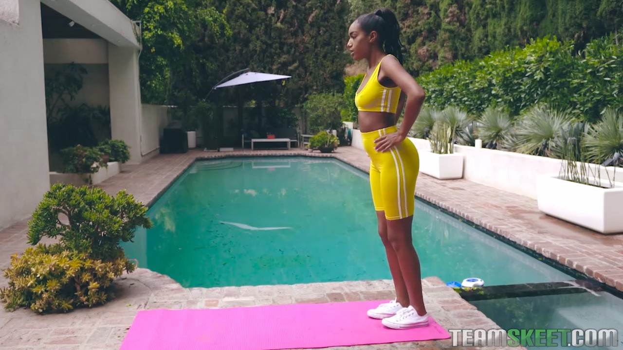 Черная хитрая жопа как обычно занималась спортом с утра - упругая грудь и крепкая попка это первостепенные задачи для нее, чтобы быть привлекательной у мужчин и соблазнить любого. Но что-то бассейн сегодня совсем холодный, а сжигать калории как-то надо. И тут так удачно подвернулся сосед, настроить которого на межрасовый секс не составило никакой проблемы. Так что, чтобы не терять время, она начала насасывать его хуй прямо у водоема, чтобы поскорее перейти к ебле - а уж там она напрыгалась так, что ни один тренажер не сравнится с позой наездницы.