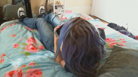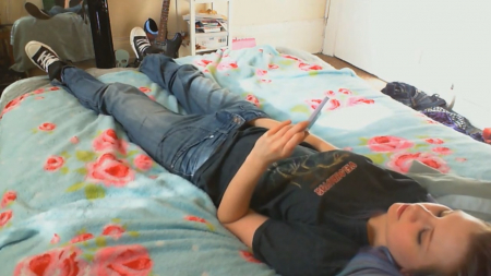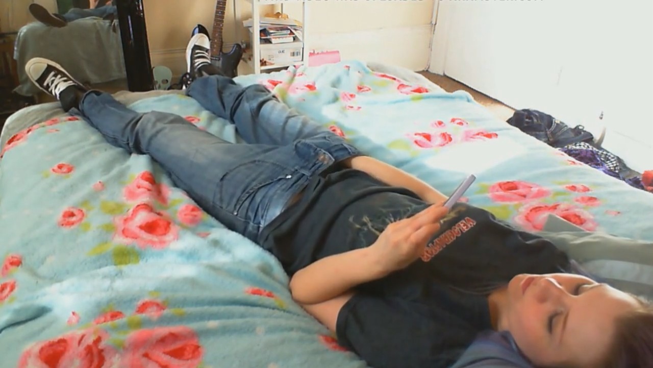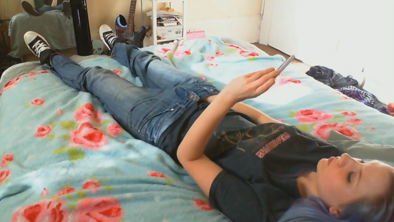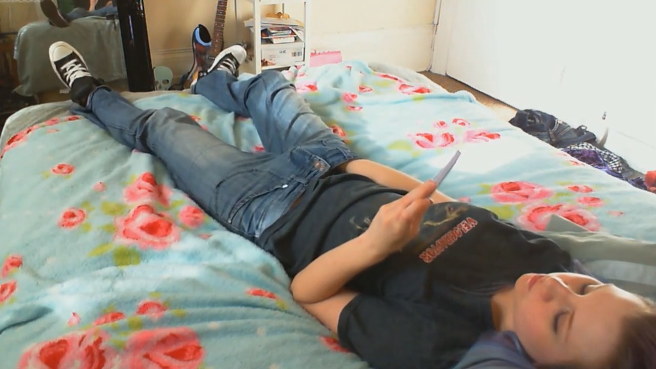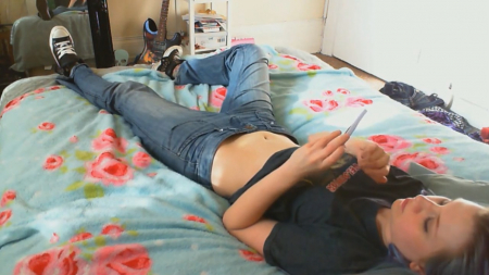 Гитаристка местечковой группы только-только вернулась домой с репетиции. Она все утро думала о том, как неплохо было бы испытать оргазм, но возможности где-то запереться не представилось за полдня. Как только девушка оказалась дома на кровати, она первым делом запустила эротическое видео на телефоне, засунув руку в джинсы. Быстрыми движениями удалось получить классные ощущения, губки сжимаются, глазки закрываются, голова откидывается и неспешный оргазм подступает все ближе и ближе. Наконец, издав негромкий стон, голубоволосая красотка кончила, отложив в сторону телефон. Дела подождут, стоит поспать и набраться сил на оставшийся день.
