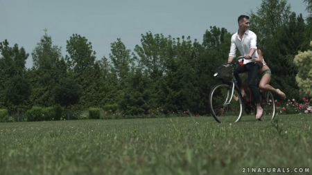Нежное создание приехало на велосипеде понюхать различные цветочки, погулять на свежем воздухе, послушать пение лесных птичек, а главное - встретиться со своим молодым человеком, появившимся как всегда внезапно. Нежно приобняв любимую и поцеловав, он усадил брюнетку на багажник велика и повез к березам, где откупорил худенькую, но очень шикарно выглядящую со стороны, попку. Двухколесный друг остался наблюдать со стороны как трахают хозяйку до самого конца, пока сперма не оказалась на сдвигающемся обратно анусе после члена. Легкий ветерок приятно обдувает уставшую красивую пару.