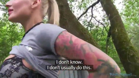 Блондинка прогуливалась по парку, когда к ней подошел незнакомец с камерой. Мужчина начал разводить телку на секс и надо сказать, у него это довольно быстро получилось. Парочка отошла с основной дороги (в глубь парка) и телка очень яростно начала дрочить незнакомцу. После чего дала в себя войти и была оттрахана.