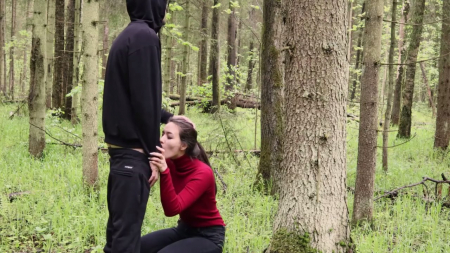 Шалунья вместе с другом не боится укусов комаров и прочих мошек. Для интересного времяпрепровождения она уговорила припарковать автомобиль на трассе, а самим отойти подальше в лес. Нутро у девушки горит как никогда, даже если пальцем тронуть клитор, сможет обкончаться на месте. Чуваку в капюшоне она сделала минетик, присев на корточки, после чего встала раком возле дерева и пошла жара. Здесь вокруг ни души, можно стонать, а делает малышка это очень возбуждающе, через силу и стиснутые скулы умоляя не останавливаться и трахать еще, с просьбами "пожалуйста" через слово. От таких допингов парняга разогнался, не вытащив хрен при оргазме. Кончили явно одновременно, а телка не один раз.
