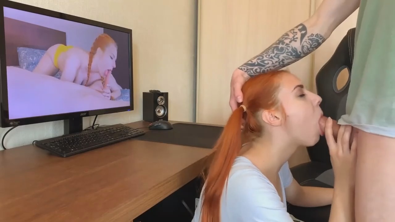 Молоденькая самочка наткнулась на страницах сайта pornhub на видео со своим участием. В нем она сосет возлюбленному. Возбуждающий ролик заставил намокнуть бритую киску, которую рыженькая милаха начала трогать через трусики. Это же увидел и второй персонаж, решившийся на вечерний перепих. Перед этим делом подруга присела возле компьютерного стола на корточки, где пососала, после чего забралась на мебель, раздвинув ножки для него. Уже поздно и на секс есть всего несколько минут времени, после чего пара пойдет в постельку просматривать сериальчик перед сном.