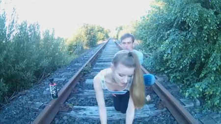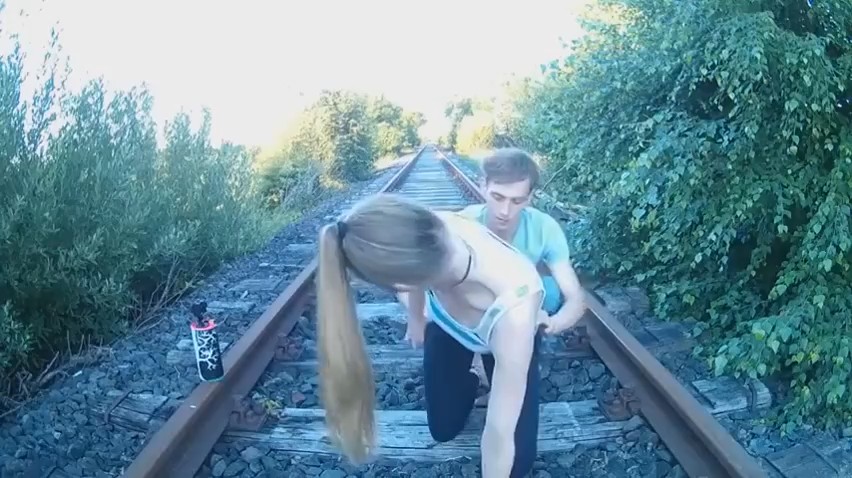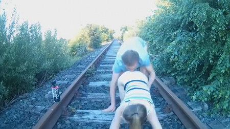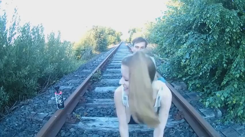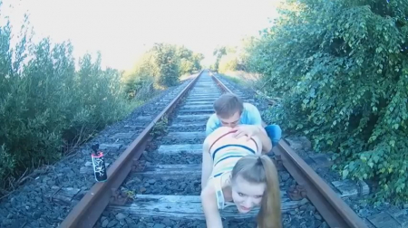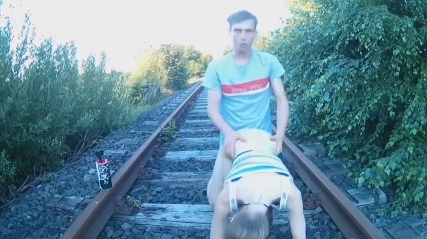Пара граффитистов пошла с баллончиком трудно смываемой краски разрисовывать заброшенные гаражи да заборы, которые принадлежат муниципалитету. Путь пролегал через железную дорогу, предназначенную для передвижения междугородних электричек. Ребятки-котятки остановились тут, пригодились инструменты для записи видео, включая штатив и камеру, а знание расписания поездов уберегает от возможности попасть под огромную стальную машину. Оглядевшись по сторонам, молодой вандал поебал стоящую раком всю дорогу светлую подругу, спустив той на попец.