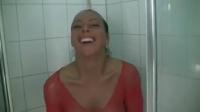 Симпатичная девушка сидя на унитазе показала запечатанную бутылку, после чего отошла с ней в душевую кабинку, где открыла, облизнув чтобы легче вошло. Началась дрочка шампанским. Оно от тряски мощно вырывается наружу, сочной струей выбиваясь через свободное место из влагалища. Приятное пощипывание, необычная обстановка и ощущения подарили всего за время меньше минуты пару оргазмов перевозбужденной немке. Ну как не попробовать хороший напиток, не облив его на крупные сиськи под прозрачной одеждой?!