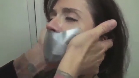 Женщина только успела закончить разговор с мужем по телефону как за спиной появился неизвестный в балаклаве. Он на цыпочках подошел со спины вплотную и приложил какую-то тряпочку с веществом, от которой женщина моментально вырубилась. Пока она была в отключке домушник успел смотать руки и ноги скотчем, рот он также заклеил чтобы жертва не кричала слишком громко, хотя она попыталась когда очухалась. В этот момент ее уже драли приложив к кухонному столу, а потом руками подвесили к дверному косяку, где насильник поигрался с киской женщины найденной в квартире игрушкой.