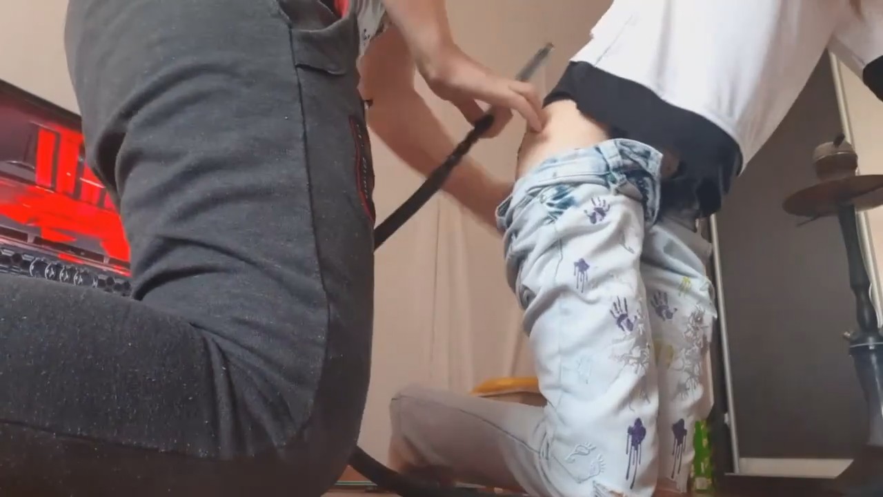 Пацанка слушала музыку с другой девкой сидя на полу и потягивая кальян. Почти сразу она представила как было бы неплохо, если эта штука окажется в пизде худенькой, ничего не понимающей телочки. Разорвав упаковку от презерватива, она натянула его на мундштук, сразу взявшись за недоумевающую подружку: стянула заранее расстегнутые джинсы, поставила на коленки и запихнула тоненькую трубку ей в вагину, повторяя решительные движения. Через несколько секунд послышались тихие постанывания, которые только увеличивались с течением времени и частоты тычков. Шлепок по жопе - видео закончилось.