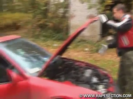 Автомобиль молодой брюнетки остановился посреди заброшенных построек. Она сама попыталась заглянуть под капот, но ничего для себя понятного там не увидела. Тут точно нужна мужская рука. Мимо проходит какой-то парень, которого она окликнула, подошла поближе, объяснила ситуацию. Он как раз похож на автомеханика или типа того. Буквально пару минут и красная тачка смогла завестись. Незнакомцу хочется вознаграждения, но деньги его не интересуют. Грубо схватив девушку за шею, он положил ее на капот, второй рукой сдернув штаны. Та стала просить и умолять, повторять о большой ошибке, но все тщетно, рот заткнули перчаткой и изнасиловали.