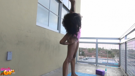Симпатичная негритянка в сексуальном розовом купальнике делает на балконе утреннюю зарядку. Молодой человек подсмотрел за девушкой и начал дрочить, смотря на это зрелище. Когда же негритянка зашла в дом, парочка занялась безудержным сексом.
