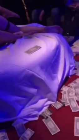 Довольно тяжело внятно объяснить что происходит на вертикальном видео, снятым обычным посетителем странного ночного клуба. Серди долларовых купюр занимаются сексом две развязные чики, а рядом стоит толпа зевак, снимающих на телефоны. Среди них даже есть инвалид в кресле-каталке и некоторое количество женщин. Судя по деньгам, это какой-то извращенный конкурс, в котором участвуют только открытые лесби. Они потрахались с игрушкой на поясе, потерлись кисками под громкую музыку и свет клуба синего цвета. Перформанс для джентельменов явно удался на славу!