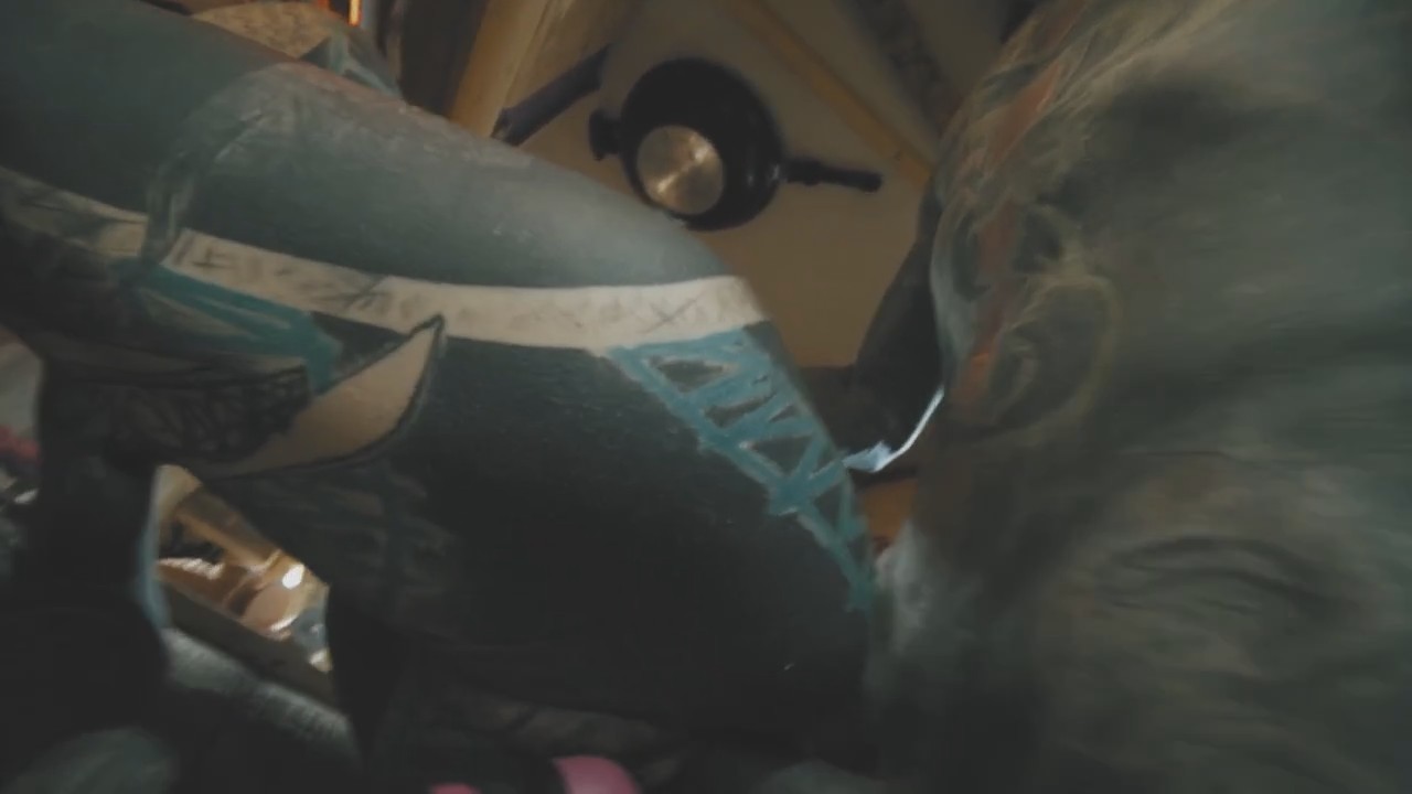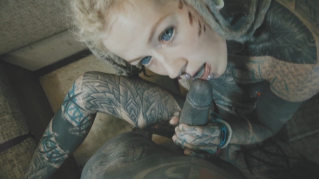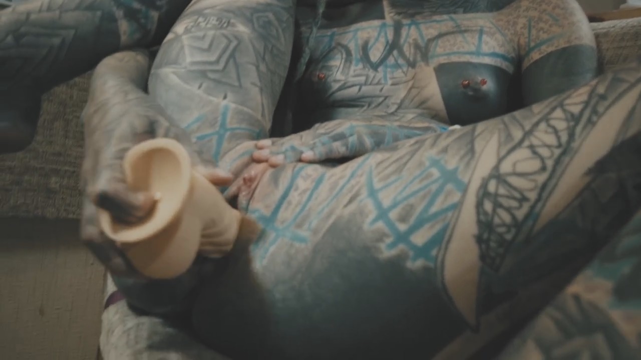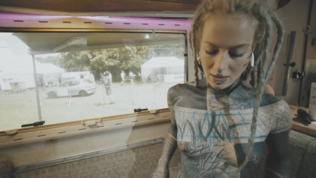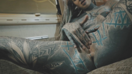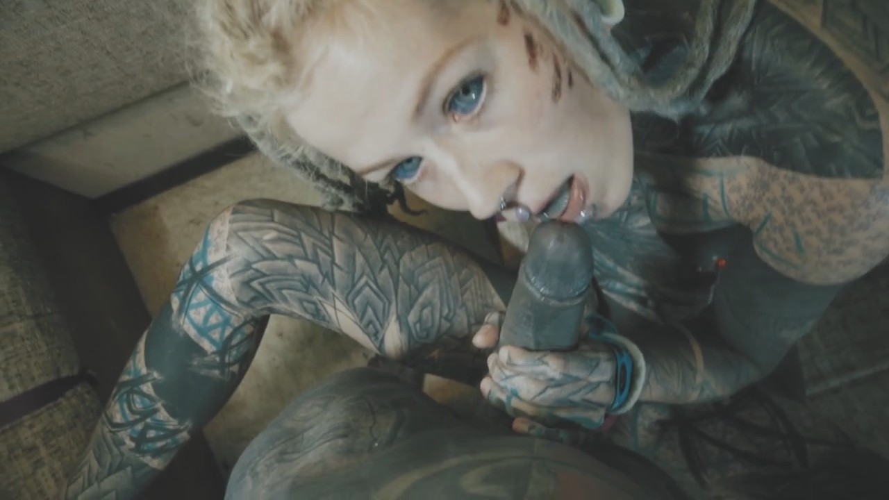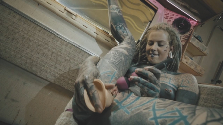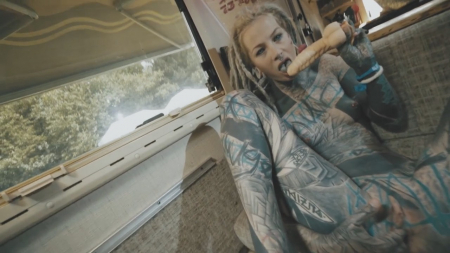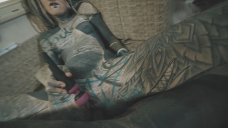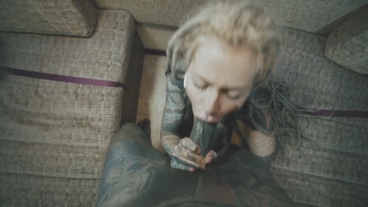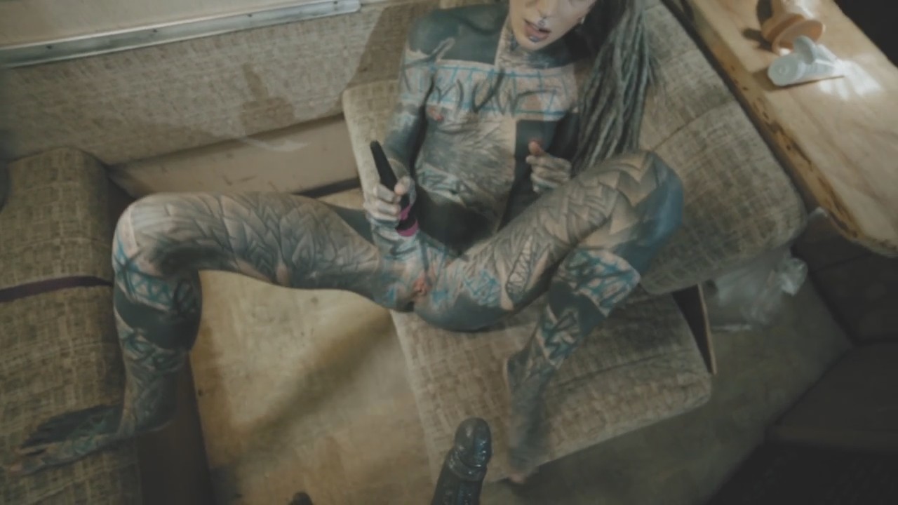 Полностью покрытая татухами телка вместе с бойфрендом, не отстающим по синеве от нее, приехала на рок концерт. Она обожает тяжелую музыку, мастурбировать и трахаться. В этот раз пара повторила все перечисленное в доме на колесах, причем шторку закрывать они не стали - будет даже интересно, если кто-то их заметит, это еще больше возбудит ненормальную неформалку. Первым делом девка подрочила в связке вибратор+фаллоимитатор, потом присоединился друган, чуть-чуть потрахавший ее фриковое тельце и накончавший на морду, откуда изо рта торчит раздвоенный язык. Ебаный нахуй блядь!