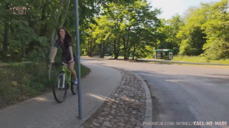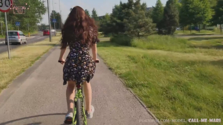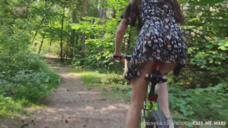 Парочка выехала покататься на велосипедах. Парень снимает свою девушку в платье, придерживая скорость сзади. Но просто колесить по городу не так интересно, как примотать немаленький дилдо к сиденью велосипеда и поехать в лес, где дорожки очень бугристые, с корнями и прочим, что может заставить приподнявшую платье жопку стонать от кайфа. Малышка не сильно стесняется прохожих и ей абсолютно плевать, что ее слышно окружающим, даже тем, кого не видно в кадре. Одна только мысль про дилдо на сидушке велика и общественное место очень заводит порнхаб-модель, у которой ножки устали стоять на полусогнутых и одновременно крутить педали.