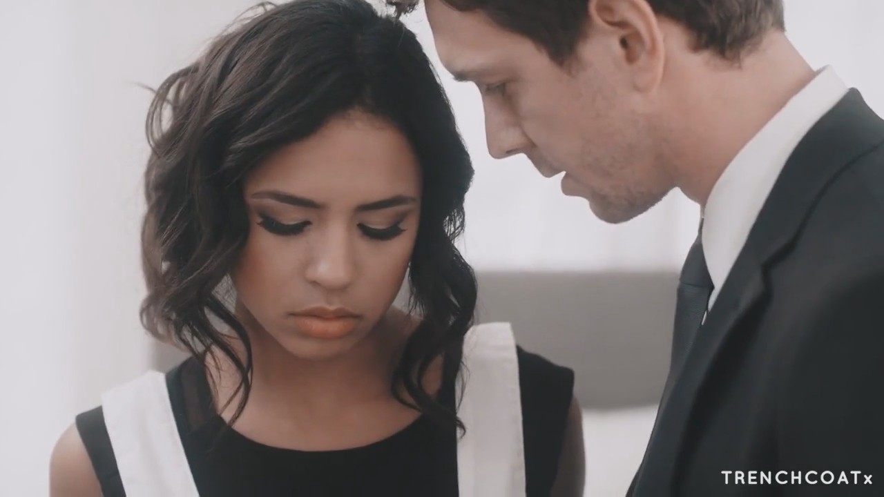 Строгий хозяин поднялся наверх, предупредив, чтобы его не беспокоила латинская горничная. Задумчивый парень в костюме стоя у окна наблюдал за работой жгучей брюнетки, а когда вышел на улицу стал свидетелем как та выбрасывает собранный мусор в его бассейн. Владелец дома попросил служанку зайти в дом, где он поставил цацу к окну и нахлестал по заднице, отправившись в ванную, чтобы умыться. По возвращении его ждала голая девушка на кровати, выставившая попку в сторону хозяина. "Что ты делаешь, зачем?" - удивился неэмоциональный работодатель, "я хочу, чтобы вы меня наказали, потому что мне понравилось!". Бизнесмен понял игру: сел рядом, полапав классную попку служанки, вытащил свой член и дал его красавице на пробу, продолжая ее грубо хватать за волосы. Страстное секс-наказание должно вразумить домработницу, если она специально не будет зарабатывать кару.