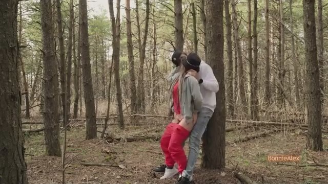 Поимел стоя среди деревьев в парке