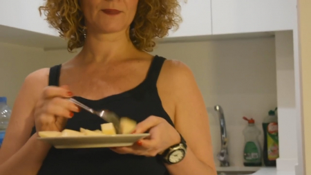 Милая семейная беседа на кухне. Жена в трусах и футболке занимается бытовыми делами, специально натянув первые повыше, чтобы было видно ее испанскую жопку. Вскоре она раздевается, из стола берет большой вибратор и садится напротив мужа на кухонный островок, раздвинув ноги, которые сильно сопротивляются хозяйке, сближаясь коленями от кайфа. Парню нравится смотреть как 45-летняя горячая мамаша получает удовольствие своими силами, особенно когда видно ее прекрасную грудь. Должна быть большая сила воли, чтобы не подойти и не трахнуть сочную женщину после ее оргазма от бездушного помощника.