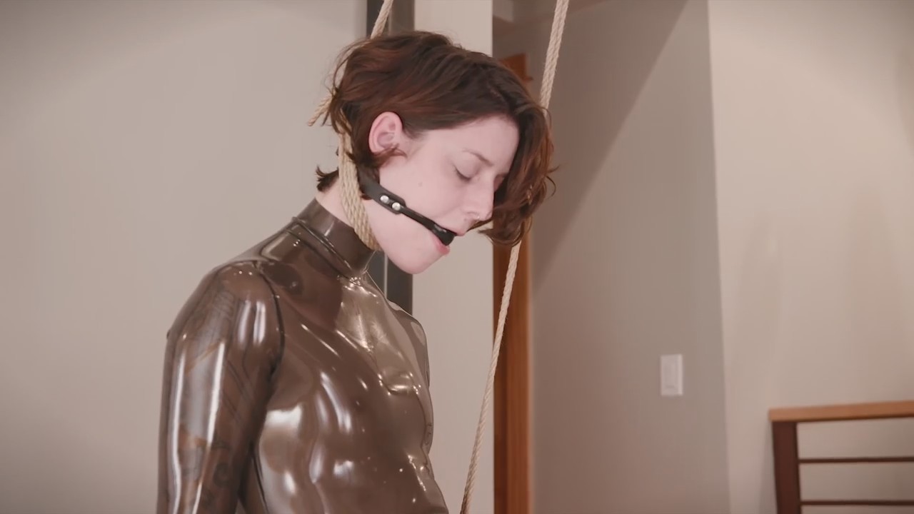 Изучившая шибари искусство телочка в латексе привязала вибратор к левой ноге. На шею себе хрупкая девушка накинула удавку, которую она тянет рукой, придушивая себя ею. Об опасности данного развлечения гласит дисклеймер, это действительно смертельно рискованно, но наша героиня не первый раз доводит себя до экстаза собачьим кайфом, капая слюной из-под кляпа. Когда слишком много одинаково кончаешь, хочется разнообразия.