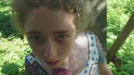 Мужчина решил отдохнуть со своей пассией на свежем воздухе. Ребята правда уединились от любопытных глаз среди деревьев и занялись очень интересным занятием. Совершеннолетняя кудрявая очаровашка довольно таки неплохо сосет, глубоко заглатывая член. А потом поворачивается к мужчине спиной и дает войти в себя. Так и чередуются ласки. А мужчина снимает жаркий секс на камеру крупным планом.