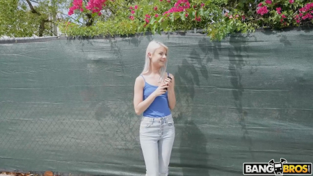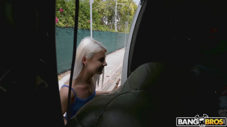 Парень представился ютубером с крупного канала, попросив незнакомку остановиться на пять минут, чтобы поболтать. За это она получила первую сотку долларов, далее еще проще стало ее раскрутить показать сиськи за дополнительную плату. Она была занята и собиралась на встречу с друзьями, как нетрудно понять, она туда так и не дошла, забравшись внутрь фургона, где обработала ротиком и влагалищем достаточно крупный член какого-то парня, тихо сидящим внутри пока 19-летнюю блондинку раскручивает более разговорчивый негодник. Ей так понравилось, что она договорилась встретиться еще раз в другой день, в этот раз она оставила большую часть заработанного в тачке на полу.