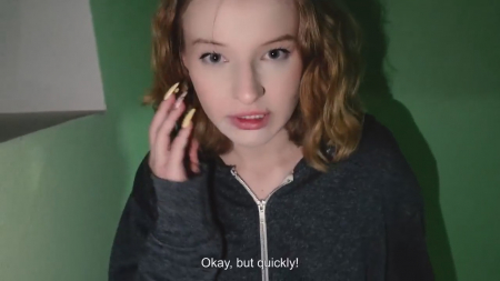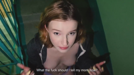 Молодой человек посреди ночи посетил свою любимку. Она не смогла его впустить домой, так как в однушке сегодня находится мамка - она не ушла на работу как планировалось. Чувак не дрочил уже несколько дней. Ему было предложено хотя бы просто посмотреть на сиськи, но этого ему показалось мало. Было решено заняться этим прямо в подъезде. Парочка потрахалась возле перил стоя рачком, стоя лицом к друг другу, что крайне неудобно, после чего юный бойфренд кончил подружке на лицо, попросив как-то незаметно проскочить мимо мамаши в ванную и отмыть лицо little hamster с волосами от спермы.
