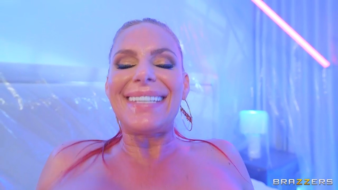 Под крутую музычку самодостаточная женщина с бело-красно-оранжевыми волосами трясет своей аппетитной задницей и собирается подрочить гладкой изогнутой игрушкой будто с инопланетного корабля, но тут появляется он - татуированный молодой человек, который обливает дамочку маслом и мы всей братией обращаем внимание на странность комнаты, где все это происходит: она полностью в полиэтиленовых завесах, в том числе и кровать, где роскошную шлюшку будут пялить не только в пизду, но и жопку, куда, собственно, и кончат, любуясь вытекающим семенем из дупла красавицы-милфы.