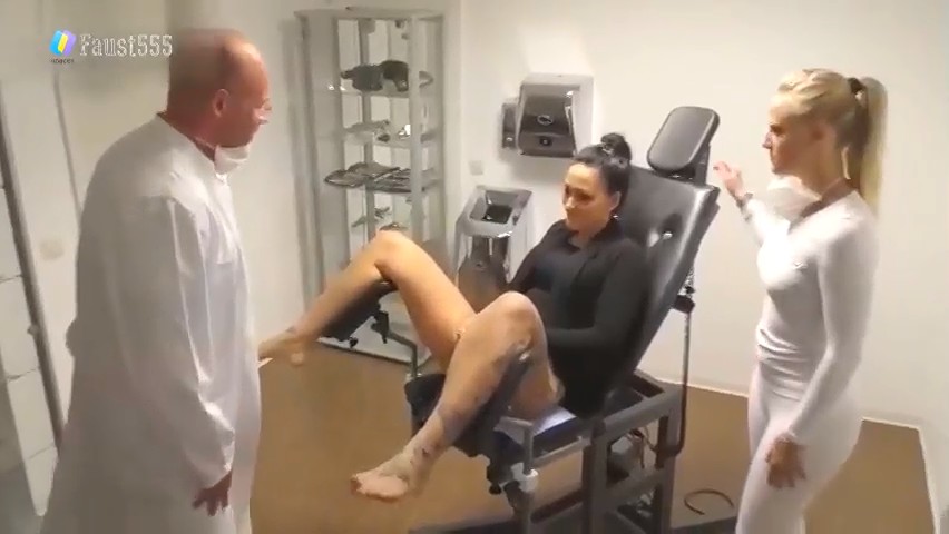 Частная клиника с хорошими отзывами, люди в белых костюмах. В кресло садится темноволосая немка без трусиков и сразу раздвигает ноги как тут положено. Лысый старый фриц тыкает пальцем в ее пирсингованную вагину и белокурая помощница вдруг начинает ему отсасывать, клиентка смотрит широкими глазами и удивляется, но даже не собирается уходить - так и ждет когда этот обслюнявленный член окажется у нее внутри. Пока доктор проверял женские способности влагалища пациентки намокать, коллега поглядела как выглядят сиськи девушки и даже одну из них попробовала на вкус. Диагноз: полностью здорова!