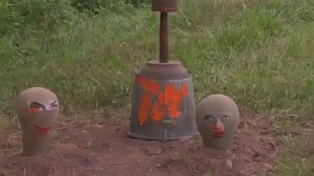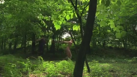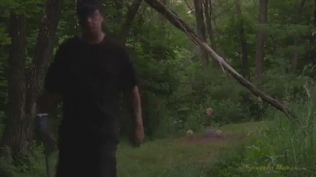 Мужчина придумал довольно извращенную игру. Он закопал симпатягу в землю по самое горло. А потом накрыл голову ведром, выставил еще две мишени и начал стрелять по ним краской. А потом убрал ведро и начал насиловать беспомощную жертву в рот, глубоко засовывая член в глотку. Отымев хорошенькую милашку, мужик кончил ей в ротик, а потом выкопал и связанную увез из леса.