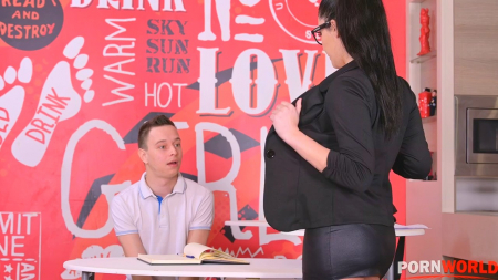 Родители оставили парнишку дома, чтобы он сделал домашнее задание по математике, которое задала ему персональная репетиторша, позволяющая заниматься на дому. Красотка пришла вовремя, но на сей раз на ее красивых ногах виднелись чулки из-под короткой юбочки, а сама жгучая итальянка в очках будто специально садилась так на стол, чтобы они были видны и наклонялась, практически показывая спелую грудь. Естественно, ученик стал решать примеры еще более медленно - его мысли заняты сексуальной учительницей, прекратившей мучить его вставший пенис и отдавшейся ему на красном диване.