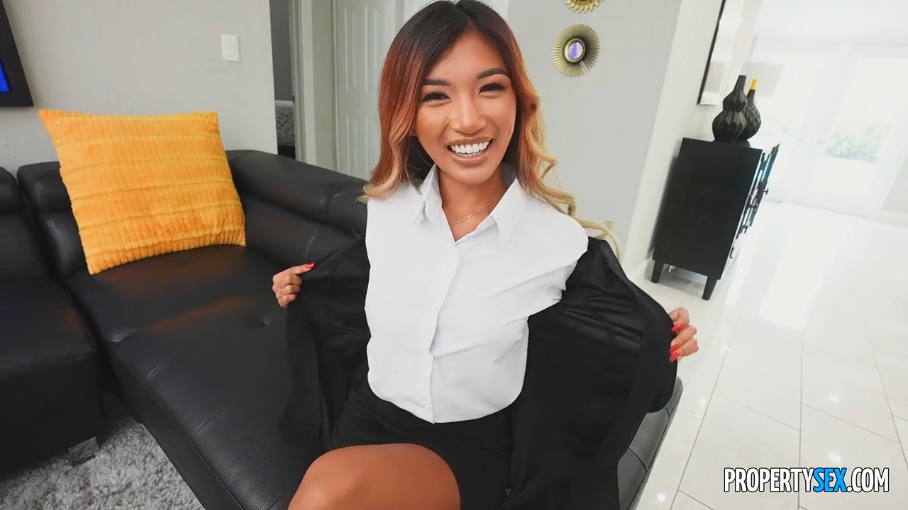 Мужчина прекрасно знал в каких апартаментах сейчас работает его коллега-риелторша. Она, как всегда, с самого раннего утра осматривает помещения, чтобы немногим позже показать их потенциальным клиентам. Но вместо них в дверь постучал мужчина, хотевший поговорить с азиатской девушкой. Она с радостью выслушала проблемы жаворонка и с непокидаемой улыбкой разделась, вкусив его длинный член своими ротиком и вагиной. Так как мы смотрит видео от лица главного героя, прям появляется желание не кончиком большого пальца ласкать анус азиатки Тринити, а резко засадить в ее узкий анал, но такого, к сожалению, не случилось.