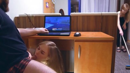 Девушка вооружилась камерой с включенной на постоянной основе вспышкой и забралась под стол к разговаривающему с кем-то по телефону бойфрендом. Он не издал лишнего намека в трубку, что прямо сейчас его хуй обрабатывает ротиком красивая подружка. Она даже пыталась ему что-то сказать с хуем во рту, но слова превратились в какие-то утробные звуки. Симпатичная девица и так повернет голову и на ляжку лицо положит парню, но неизменно одно - ей самой нравится сидеть в полумраке под столом и сосать, а также ей приятно, что ему приятно от таких ласк - даже головкой по щеке постучали в благодарность.