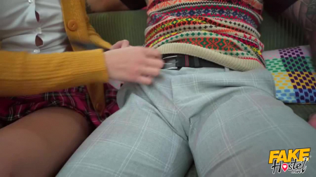 Телочка в очках слушала музыку когда в ее комнату заглянул неизвестный ей парень. Он сделал комплимент ботаничке (ее голеньким ножкам) и та сразу растаяла, позволив стянуть с себя трусики, чтобы оголить сочную киску. В самый развратный момент приходит и второй ботан - парень, который все никак не мог раскрутить сумасбродную дурочку на перепихон. Как-то так получилось, что в итоге ее вообще пустили по кругу ребята вдвоем, а ее парень остался благодарным незнакомцу за то, что теперь он будет постоянно ебать подружку в ротик и киску. [FakeHostel] Lady Dee - Geeky But Freaky.