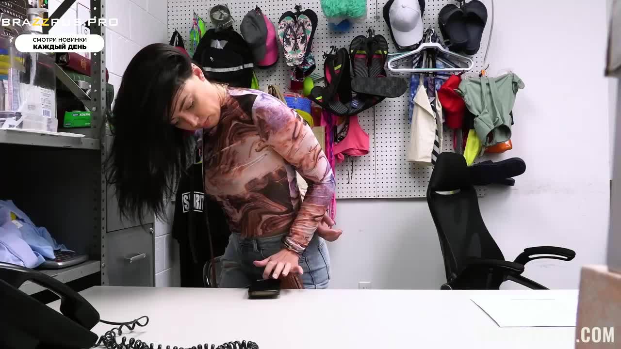 Очередная магазинная воровка делает невинный вид, будто она ничего плохого не сделала. На самом деле, ее заприметили на камерах видеонаблюдения, а точнее покупательница занималась непристойным обнажением в туалете, где трахалась с несколькими парнями. Пока охранник вышел проверить взятые данные, симпатяга попыталась уговорить помочь своего знакомого по телефону, но тот отказался. Вернулся мужчина в синей рубашке. Он посмотрел несколько дополнительных записей и обнаружил, что его жертва еще и воровка, но она не взяла ничего такого ценного. Впереди девушку ждал досмотр с полным обнажением, а также предложение перепихнуться на столе, после чего брюнеточка может спокойно уйти домой, а завтра вернуться за добавкой.