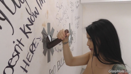 Стройная красотка зашла в интим магазин и приобрела диск с фильмом для взрослых. На кассе продавец услужливо рассказал очаровательной покупательнице про специальную комнату, в которой она может посмотреть кино и получить новые незабываемые ощущения. Не долго думая, девушка практически забежала в эту комнату и стала заглядывать в дырку в стене, но никого не обнаружила. Тогда милашка стала звать, но ответом снова была тишина. Но, предвкушая невероятное удовольствие, девушка так легко не сдается. Она смотрит фильм и начинает постепенно раздеваться. Самое удивительное, что "подоспел" и незнакомец, который засунул в дырку уже готовый к бою фаллос. Сексуальная брюнетка чуть ли не пищит от восторга при виде большого члена и с радостью сосет его и насаживается на большой агрегат.