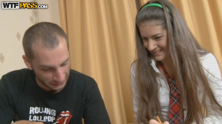 Симпатичная девушка попросила однокурсника помочь ей с английским. Разговаривая на английском языке, парень уламывает постепенно симпатягу на секс. Стройная девушка соглашается довольно быстро и получает нежные ласки горячим языком (парень вылизал киску, дабы милую подружку возбудить). Несмотря на то, что после доставленного удовольствия очаровашке, парень и сам был уже полностью готов, девушка все же хорошенько отсосала твердый ствол, а потом дала отыметь себя и в вагину и в узенький анус.