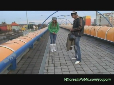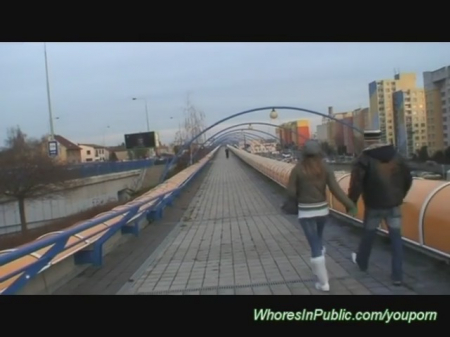 Молодой человек встретил свою любимую и они пошли гулять. Проходя по мосту красотке приспичило в туалет сходить, и девушка сделала это прямо там, не пытаясь где-нибудь укрыться. Более того, похотливая сучка начала приседать как будто на члене скачет, а после парню сделала минет. Молодой человек отымел свою прекрасную телку в вагину, и парочка абсолютно не обращала внимания на проходящих мимо людей (наоборот, то что на них глазели, придавало молодым любовникам наибольшее наслаждение от спонтанного секса).