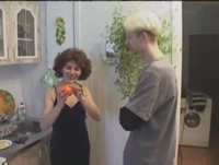 Креативный обед от заботливой мамочки. Решив накормить голодного сына, короткостриженная женщина срезала кожуру мандарина в одном месте и дала насытиться сочной мякотью молодому парню. Когда же во фрукте получилось небольшое углубление, развратная мамаша присела на корточки перед сыном и, стянув с него брюки и трусы, начала одевать мандарин на вялый член, а второй рукой стимулировать сам ствол. Парень оказался совсем не против подобных действий и уже в довольно скором времени, будучи в уже возбужденном состоянии, возбудил и мамку, а потом хорошенько оттрахал симпатичную тетку.