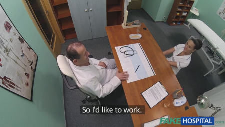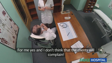 Прелестная брюнетка пришла знакомиться с новым доктором, поскольку в свой первый рабочий день такой возможности у девушки не было (мужчина выходной был). Дружеская беседа плавно переросла во флирт, а после и вовсе вышла за грани разумного, поскольку медсестра начала доктору показывать свои прелести (так сказать, решила познакомиться поближе с интересным мужчиной). Пока пациентов не было, доктор отшпилил свою помощницу на рабочем столе и наполнил мокрое лоно спермой.