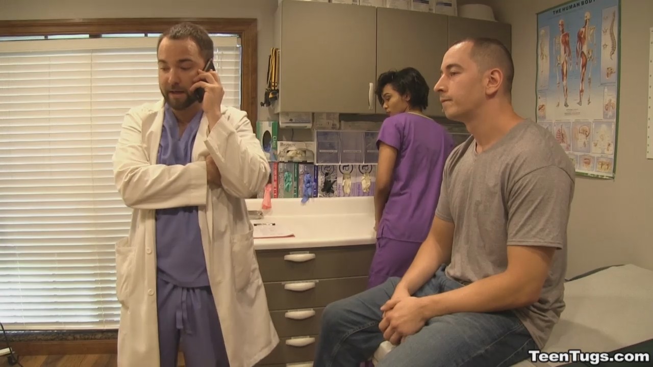 Мужчина пришел в клинику, желая стать донором спермы и срубить побольше бабла. Но прежде его должен осмотреть доктор. Не успев приступить к осмотру, врач вышел из кабинета по делам, а развратная медсестричка все свое внимание обратила на клиента. Развратная малышка схватилась за писюн, и мужчина не смог противиться предстоящему удовольствию - просто лежал и кайф ловил, пока короткостриженная медсестричка ему дрочила.
