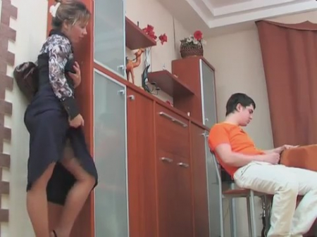 Верите ли вы в судьбу? Как бы там ни было, но то, что произошло, можно назвать счастливым случаем, а может чистой воды совпадением. А дело было так - проводив маму на работу, молодой человек почувствовал себя полноправным хозяином в квартире и сел в гостиной за столик посмотреть журнал. Но такие уж там девочки изображены, что устоять невозможно - может быть именно поэтому парень схватился за писюн. Вот как раз мастурбирующего юношу и увидела однозадачная соседка (дверь была не заперта и милф прошла потихоньку). Возбужденная дама набросилась на парнишку, застав того врасплох, и принудила соседа к сексу - не силой заставила, просто он не смог сопротивляться умелым ласкам.