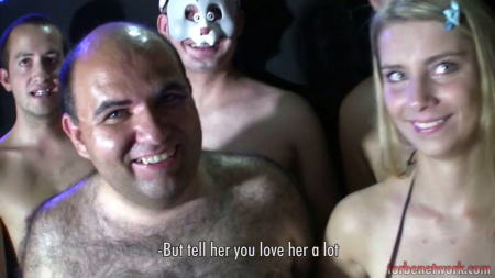 Ночное заведение, куда пускают только по специальному приглашению приняло сисястую девушку, которая будет сегодня обслуживать толпу обычных мужиков. Некоторые из них женатые, поэтому на их лицах маски. Ребята облапали телку, пока она дрочила два хуя, после чего она опустилась на корточки и стала без разбора брать у всех в рот. Самые несдержанные стали кончать очень быстро, а она продолжила глотание шпаг остальных, несмотря на семя, стекающее по волосам и подбородку. Через непродолжительное время она вовсе перестала видеть из-за литра спермака, теперь уже стекающему по всему личику грудастой малышки.