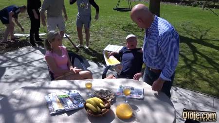У молодой девушки довольно зрелый любовник. Но девушку абсолютно не смущает огромная разница в возрасте. Любовники сидели на террасе в то время как их окружила толпа дедов с протестующими плакатами. Дело в том, что соседи пожилого любовника узнали о его связи с молодухой и захотели потрахаться с молодой. И девушка отдалась толпе дедов.
