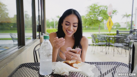 Телка накачала себе губы с сиськами, но для таких буферов выглядит она слишком стройно. Поэтому она ничего не придумала кроме как жрать пиццу в кафешке. Пепперони в этот раз готовил какой-то криворукий грузин, поэтомму на вкус оно было как говно. Благо, что ее развлекал парень с камерой, который уделял ей порой слишком много внимания. Но дело приняло новый оборот, когда ей в руки попало от него четыре сотни баксов - они сразу нашли какой-то стремный чулан, а телочка сделала то, чего умеет лучше всего - мастерски отсосала и отдала киску на растерзание.